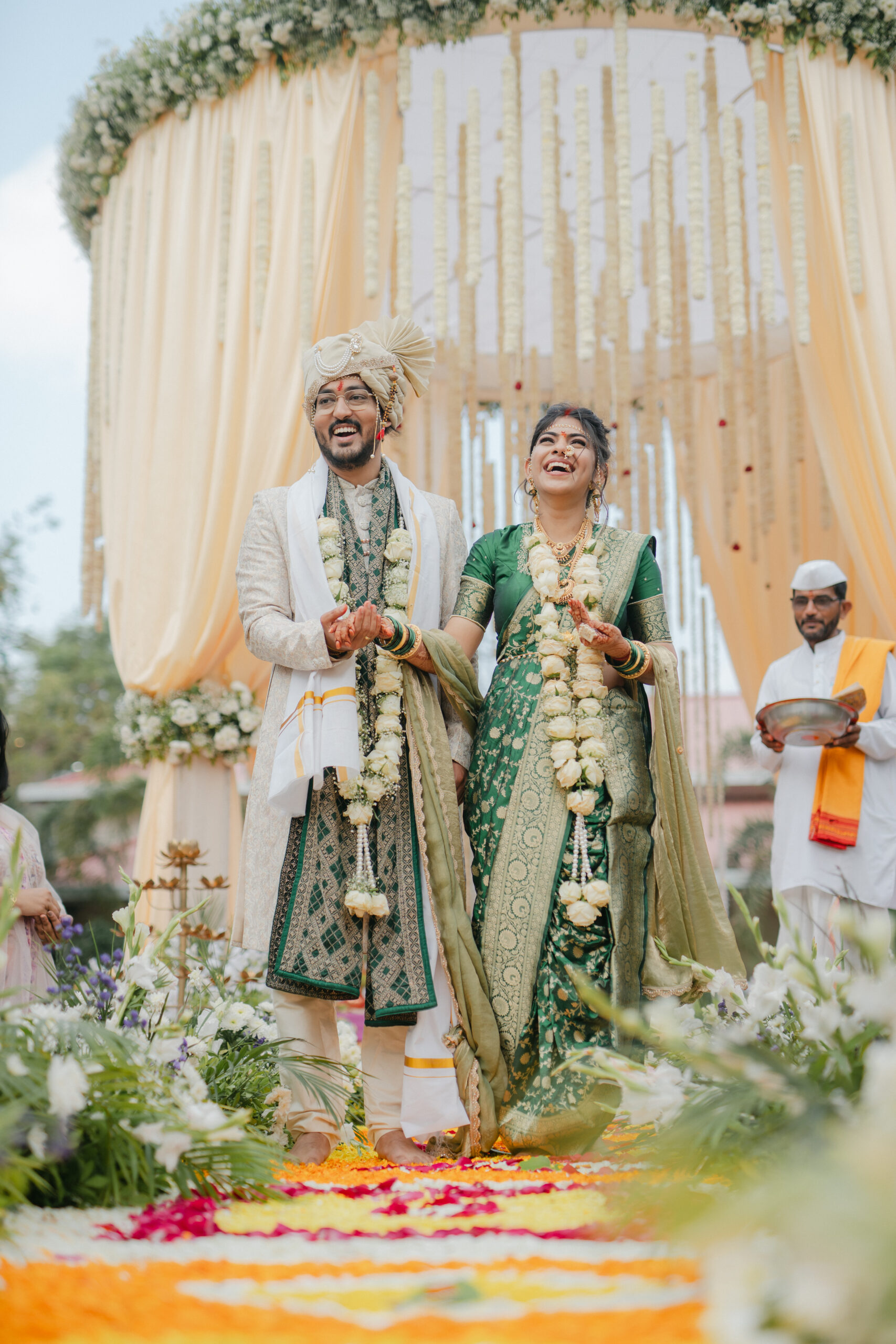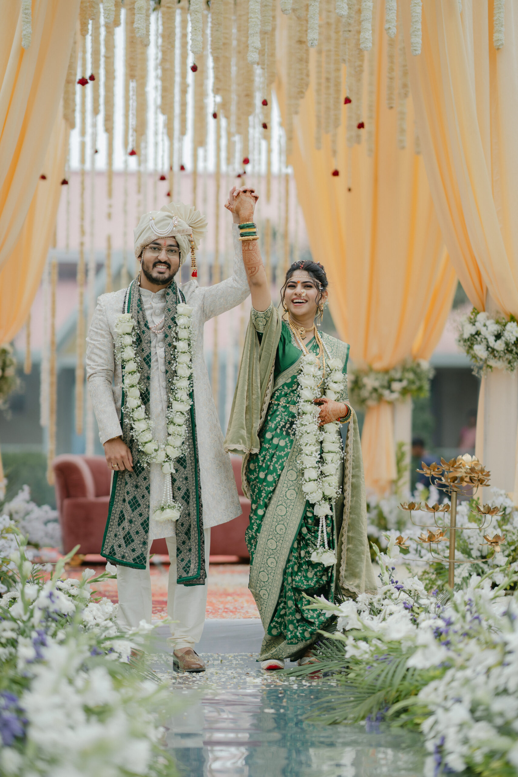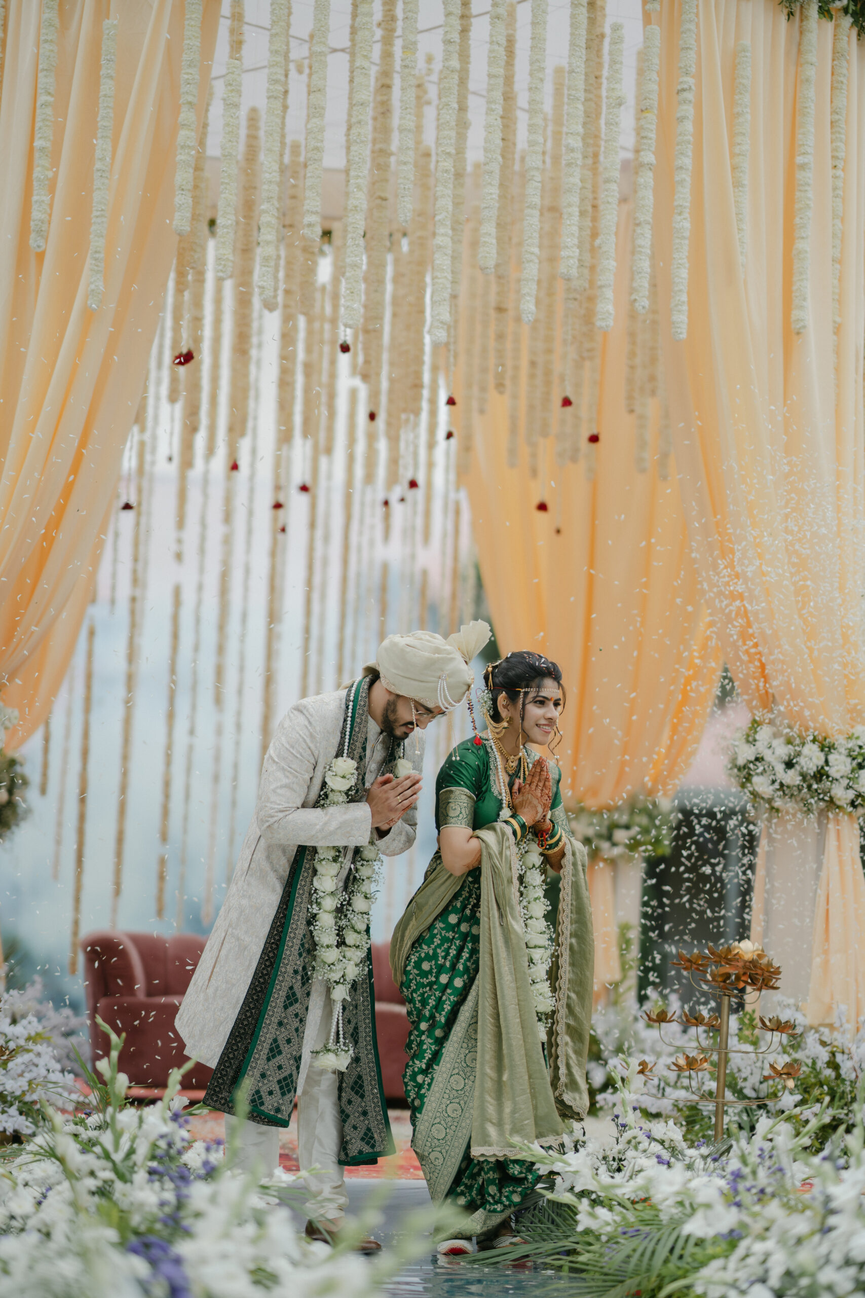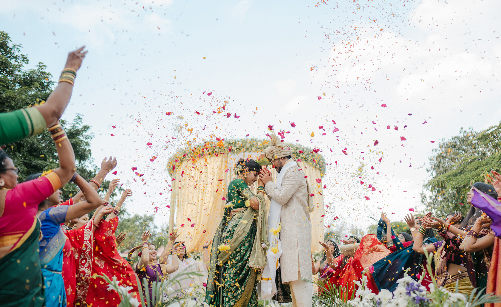 Amidst a dreamy garden adorned with blooming flowers and lush green plants, Poorvashree and Ajinkya celebrated their union. Surrounded by nature’s beauty and love’s blessings, their wedding unfolded in timeless elegance, a perfect blend of romance and serenity.