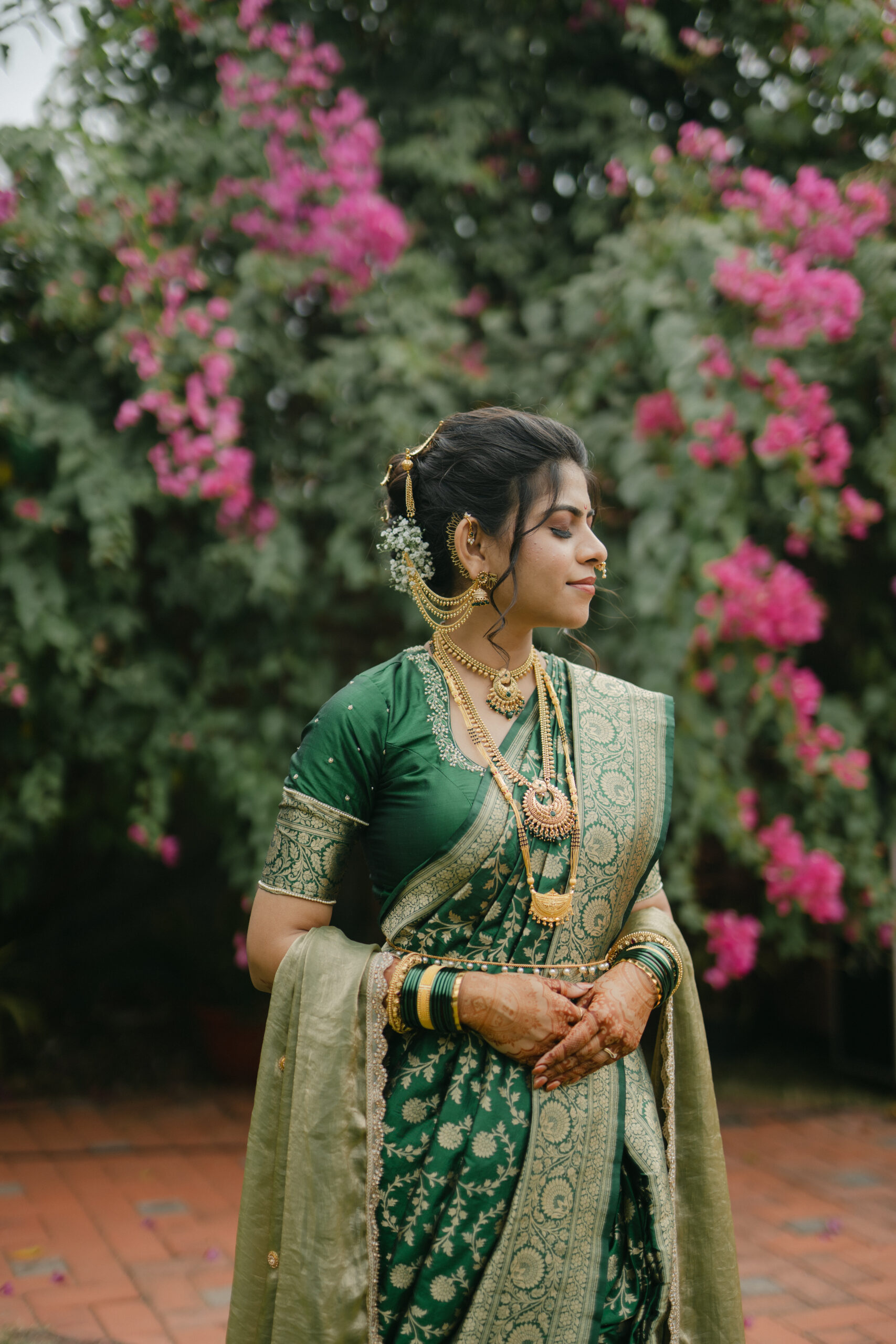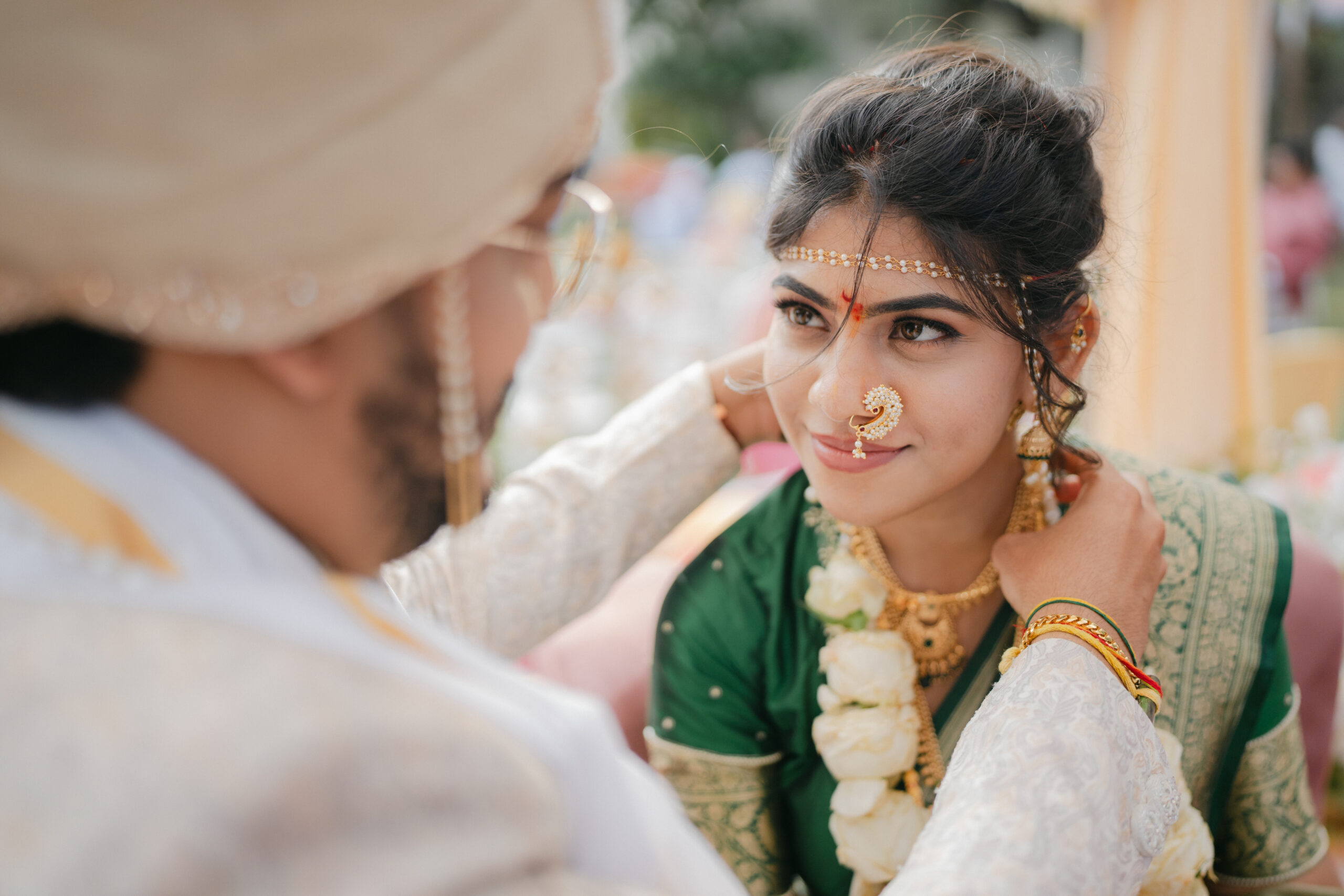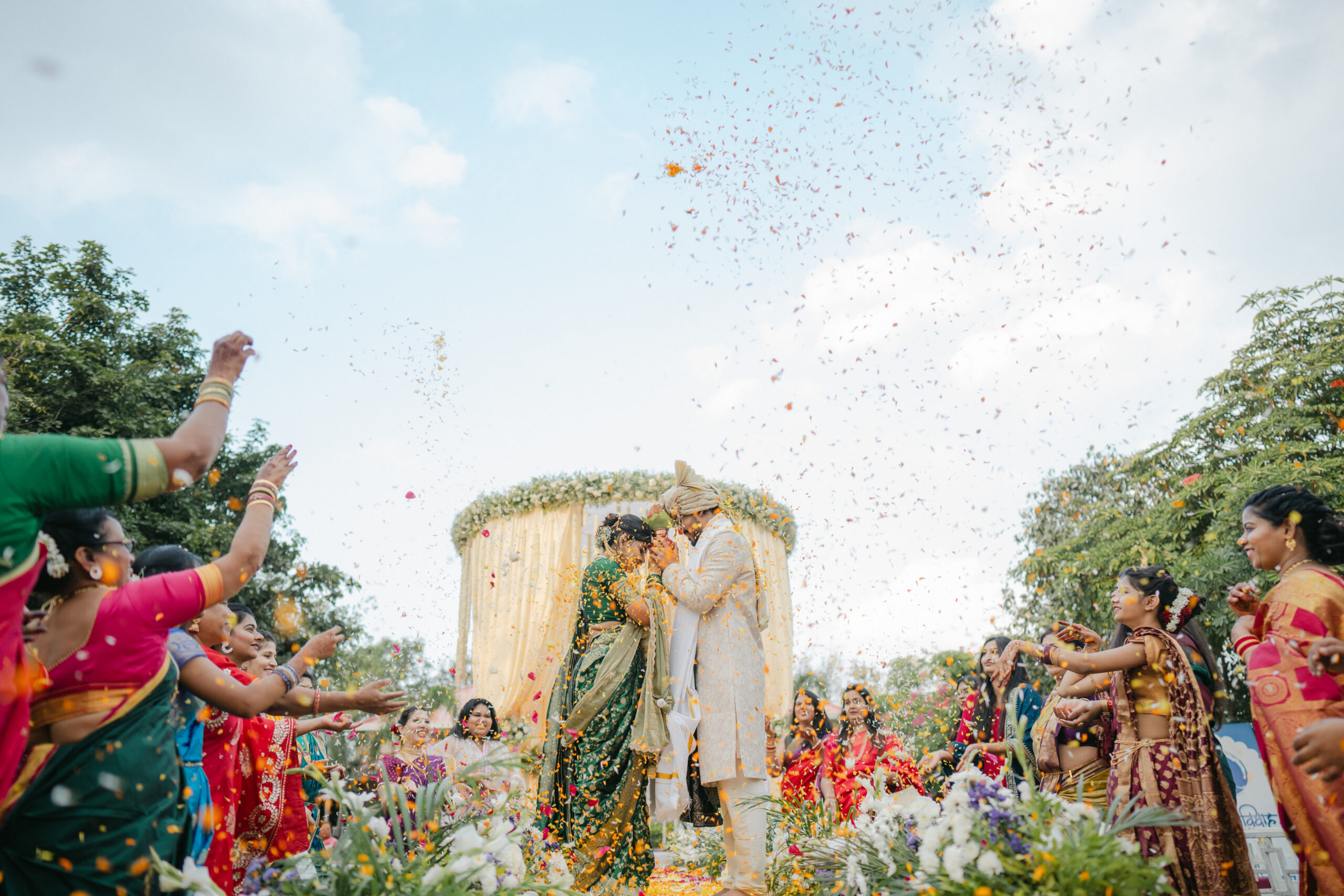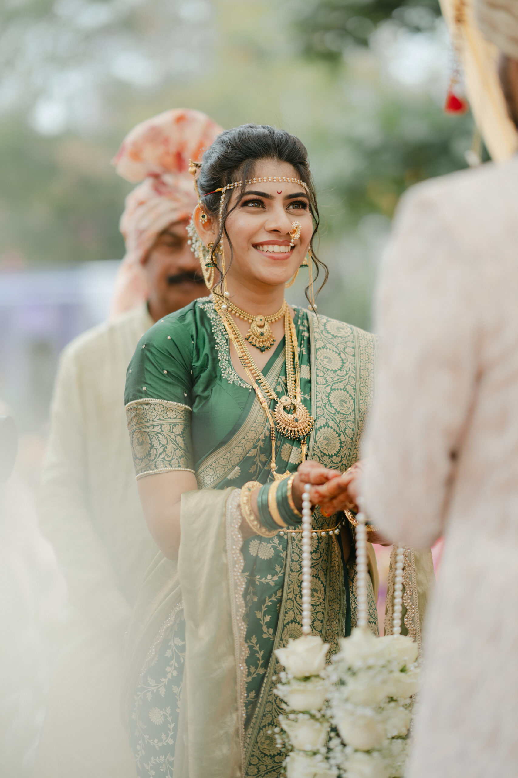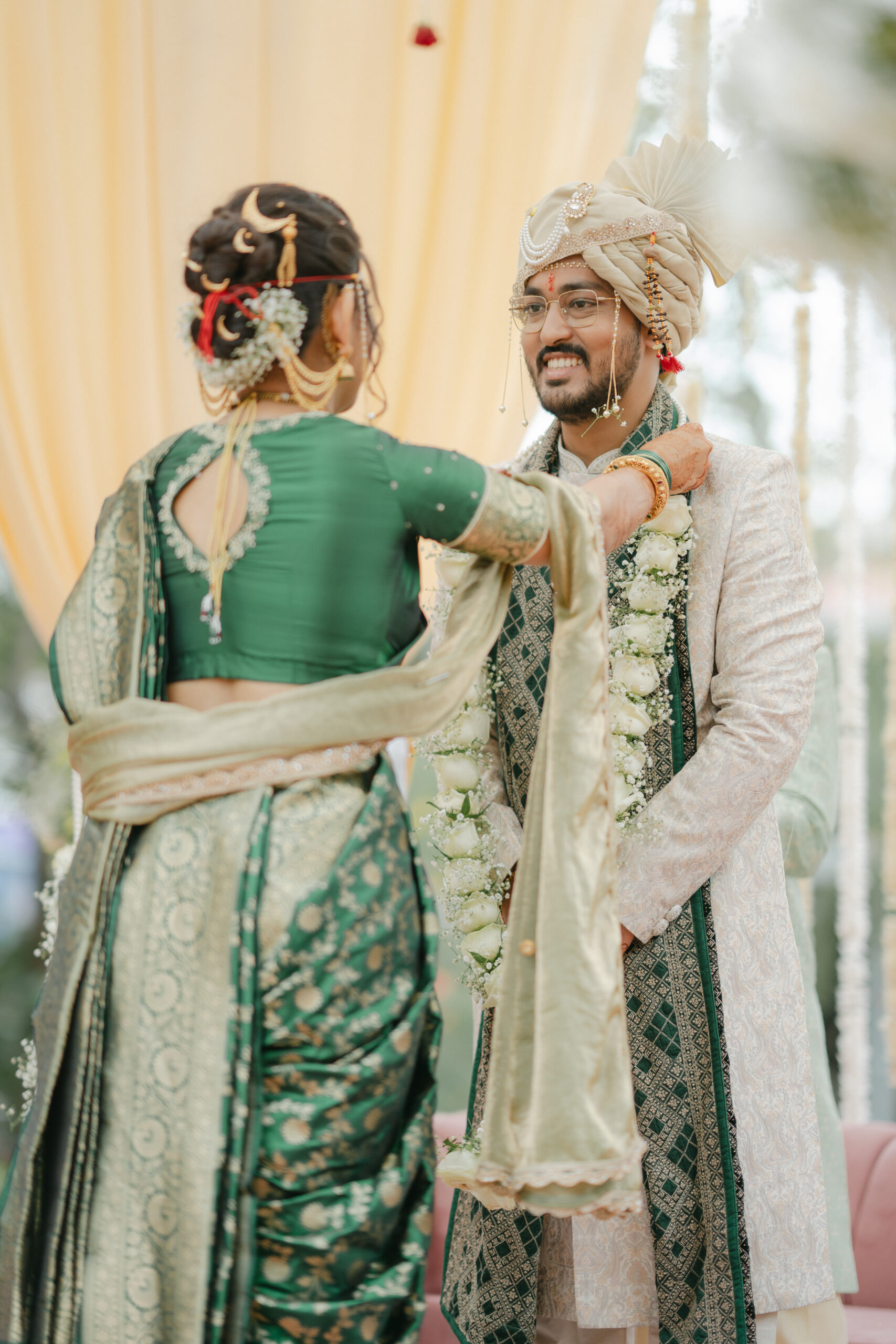 Amidst a dreamy garden adorned with blooming flowers and lush green plants, Poorvashree and Ajinkya celebrated their union. Surrounded by nature’s beauty and love’s blessings, their wedding unfolded in timeless elegance, a perfect blend of romance and serenity.